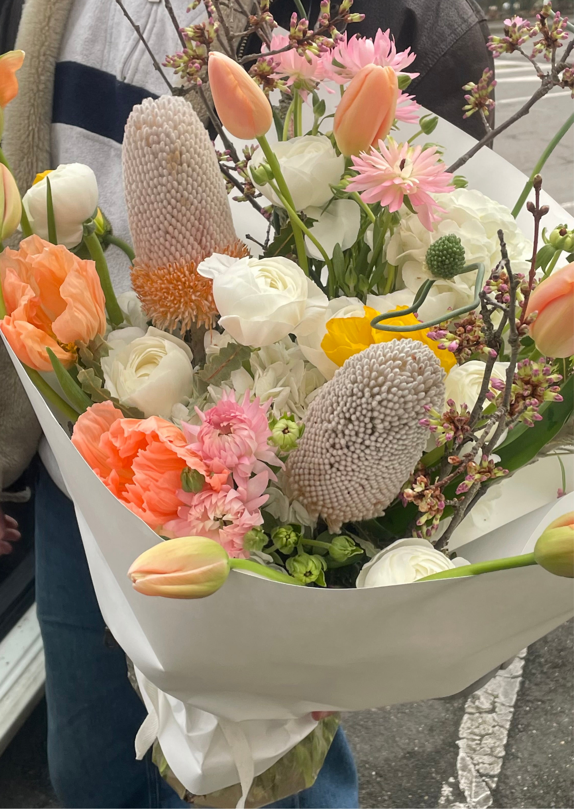 An extra large bouquet made with seasonal flowers, in your chosen colors and style. It can be generous in size or created with rare and exclusive flowers — depending on your wishes.